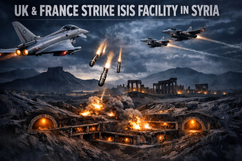 According to the United Kingdom’s Ministry of Defence, Royal Air Force Typhoon FGR4 jets, supported by a Voyager aerial refueling tanker, joined French fighter aircraft in the strike Saturday evening north of the ancient city of Palmyra in Homs province. Intelligence had identified the mountainous site as a former ISIS storage hub with multiple access tunnels leading underground.