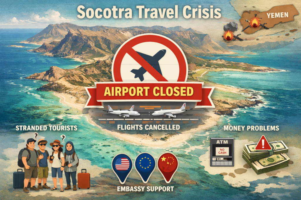 The crisis began last week when the UAE withdrew its troops from Socotra following growing pressure from Saudi Arabia, part of a broader dispute over influence in Yemen’s ongoing civil war. With Emirati forces leaving, control over the island’s airport shifted, and air traffic suddenly stopped, stranding an estimated 400–600 tourists from across Europe, the U.S., Asia and beyond.