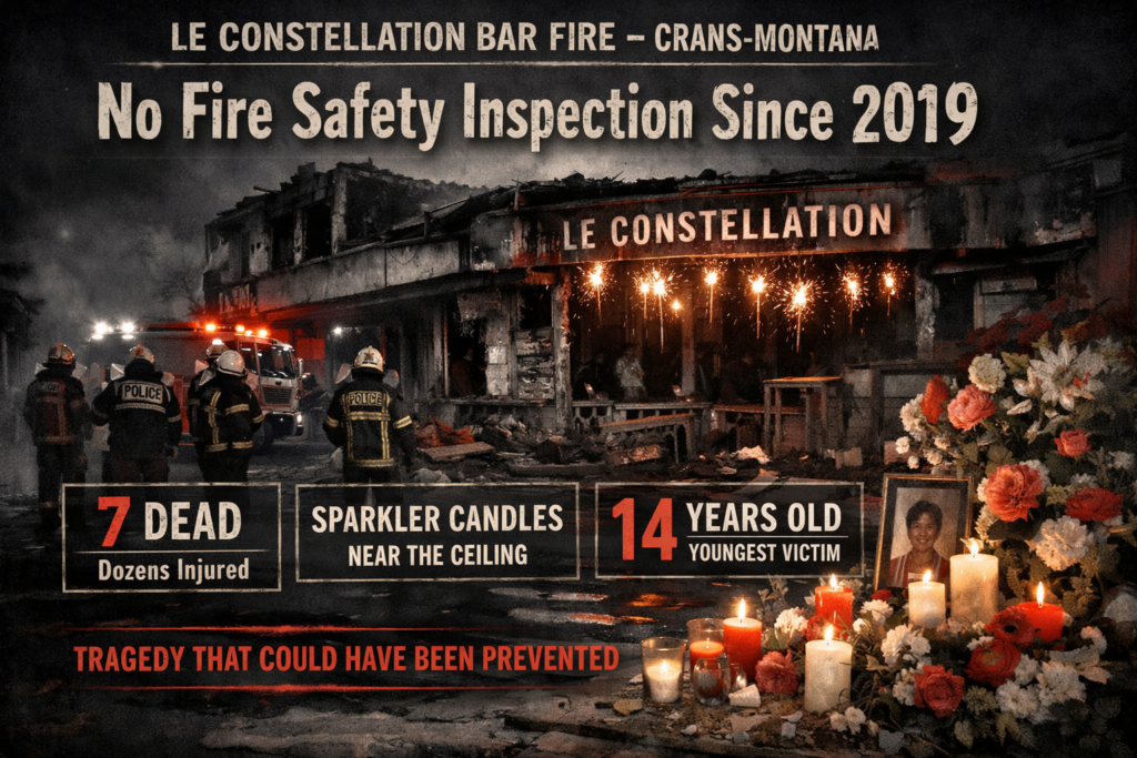 CRANS-MONTANA, Switzerland — A devastating fire tore through the Le Constellation bar during New Year’s Eve celebrations, killing 40 people and injuring more than 100, and authorities have now revealed that the ski-resort venue had not been inspected for fire safety in over five years. This failure in routine checks has raised serious questions about regulatory oversight.